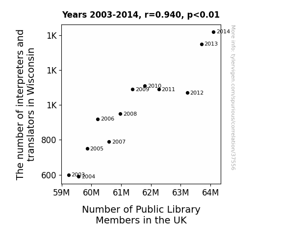 This means 88.4% of the change in the one variable (i.e., Number of Public Library Members in the UK) is predictable based on the change in the other (i.e., The number of interpreters and translators in Wisconsin) over the 12 years from 2003 through 2014.