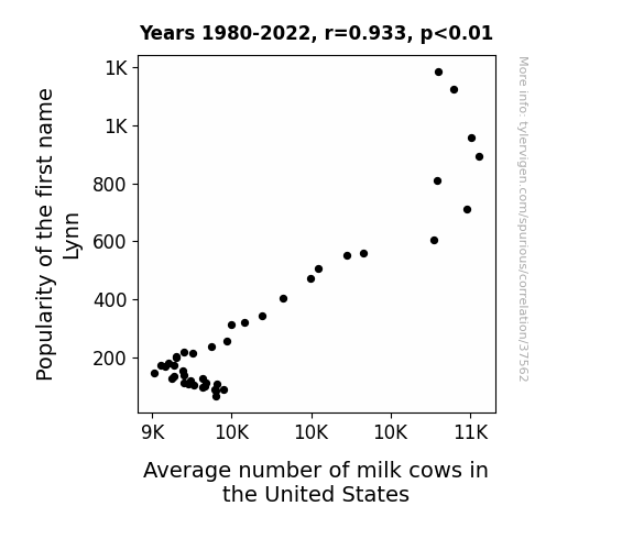 This means 87% of the change in the one variable (i.e., Average number of milk cows in the United States) is predictable based on the change in the other (i.e., Popularity of the first name Lynn) over the 43 years from 1980 through 2022.