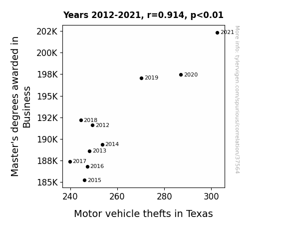 This means 83.5% of the change in the one variable (i.e., Motor vehicle thefts in Texas) is predictable based on the change in the other (i.e., Master's degrees awarded in Business) over the 10 years from 2012 through 2021.