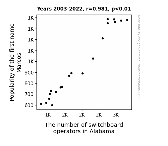 This means 96.1% of the change in the one variable (i.e., The number of switchboard operators in Alabama) is predictable based on the change in the other (i.e., Popularity of the first name Marcos) over the 20 years from 2003 through 2022.