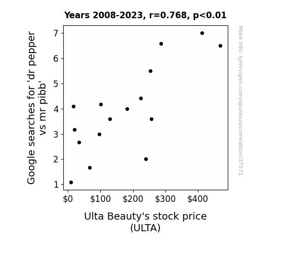 This means 59% of the change in the one variable (i.e., Ulta Beauty's stock price (ULTA)) is predictable based on the change in the other (i.e., Google searches for 'dr pepper vs mr pibb') over the 16 years from 2008 through 2023.