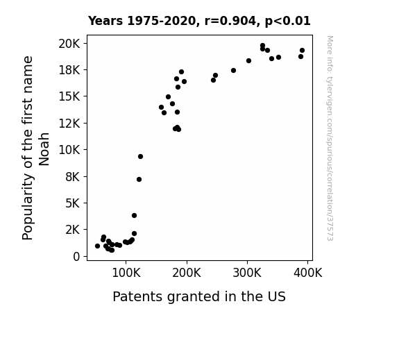 This means 81.8% of the change in the one variable (i.e., Patents granted in the US) is predictable based on the change in the other (i.e., Popularity of the first name Noah) over the 46 years from 1975 through 2020.