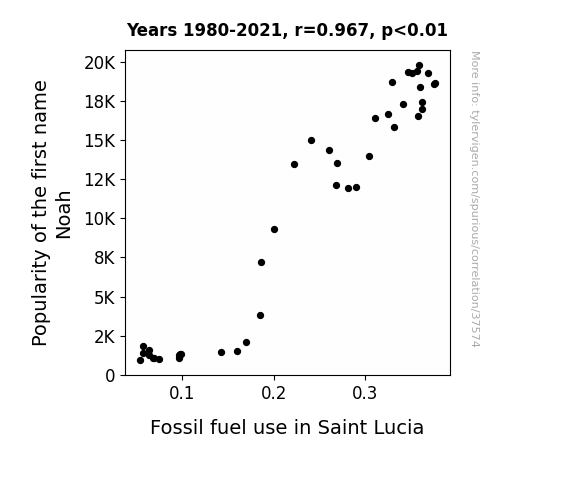 This means 93.5% of the change in the one variable (i.e., Fossil fuel use in Saint Lucia) is predictable based on the change in the other (i.e., Popularity of the first name Noah) over the 42 years from 1980 through 2021.