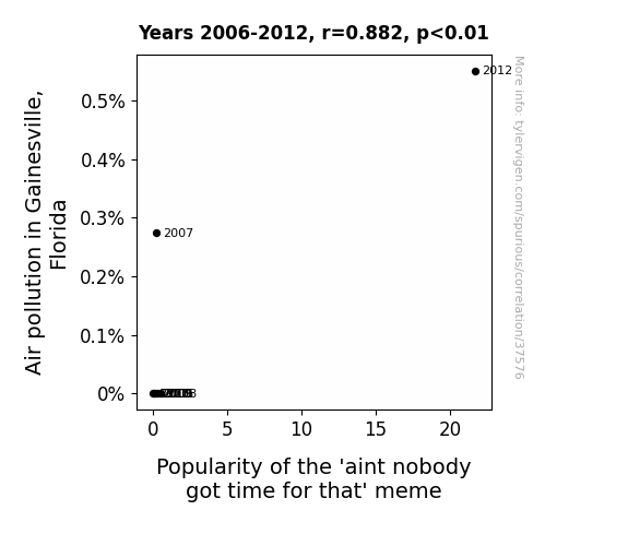 This means 77.9% of the change in the one variable (i.e., Popularity of the 'aint nobody got time for that' meme) is predictable based on the change in the other (i.e., Air pollution in Gainesville, Florida) over the 7 years from 2006 through 2012.