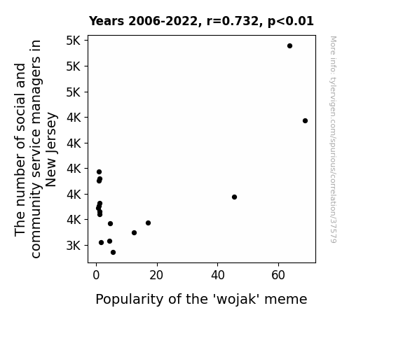 This means 53.6% of the change in the one variable (i.e., Popularity of the 'wojak' meme) is predictable based on the change in the other (i.e., The number of social and community service managers in New Jersey) over the 17 years from 2006 through 2022.