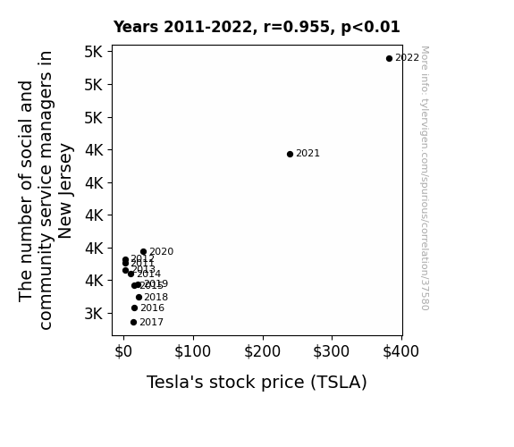 This means 91.2% of the change in the one variable (i.e., Tesla's stock price (TSLA)) is predictable based on the change in the other (i.e., The number of social and community service managers in New Jersey) over the 12 years from 2011 through 2022.
