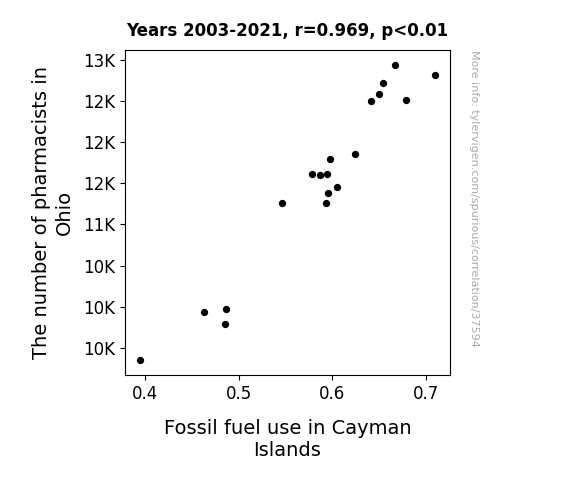 This means 93.9% of the change in the one variable (i.e., Fossil fuel use in Cayman Islands) is predictable based on the change in the other (i.e., The number of pharmacists in Ohio) over the 19 years from 2003 through 2021.