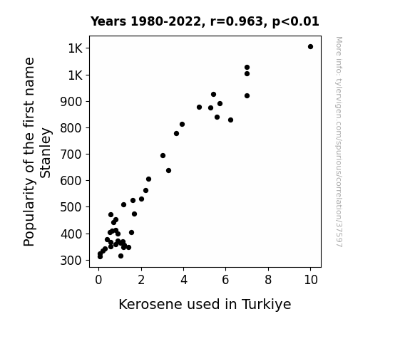This means 92.7% of the change in the one variable (i.e., Kerosene used in Turkiye) is predictable based on the change in the other (i.e., Popularity of the first name Stanley) over the 43 years from 1980 through 2022.