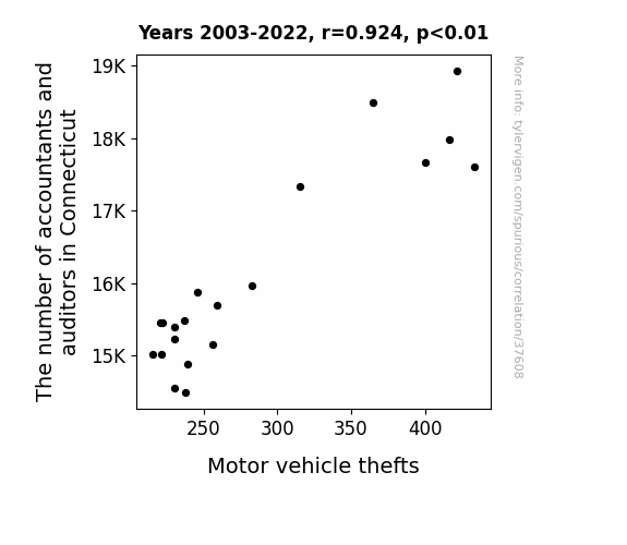 This means 85.4% of the change in the one variable (i.e., Motor vehicle thefts) is predictable based on the change in the other (i.e., The number of accountants and auditors in Connecticut) over the 20 years from 2003 through 2022.