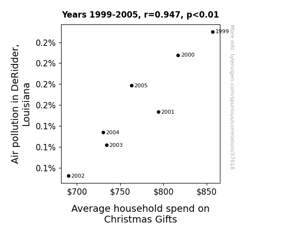 This means 89.6% of the change in the one variable (i.e., Average household spend on Christmas Gifts) is predictable based on the change in the other (i.e., Air pollution in DeRidder, Louisiana) over the 7 years from 1999 through 2005.