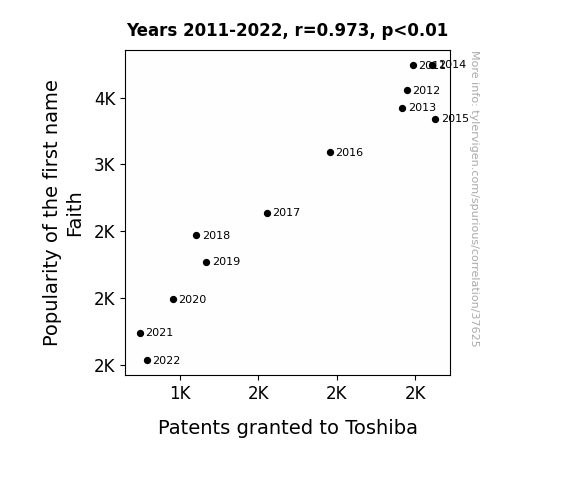This means 94.6% of the change in the one variable (i.e., Patents granted to Toshiba) is predictable based on the change in the other (i.e., Popularity of the first name Faith) over the 12 years from 2011 through 2022.