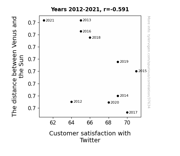 This means 34.9% of the change in the one variable (i.e., Customer satisfaction with Twitter) is predictable based on the change in the other (i.e., The distance between Venus and the Sun) over the 10 years from 2012 through 2021.