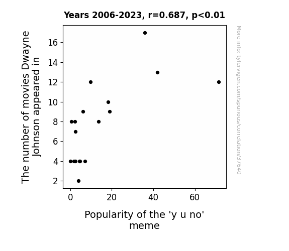 This means 47.2% of the change in the one variable (i.e., Popularity of the 'y u no' meme) is predictable based on the change in the other (i.e., The number of movies Dwayne Johnson appeared in) over the 18 years from 2006 through 2023.