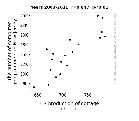 This means 71.8% of the change in the one variable (i.e., US production of cottage cheese) is predictable based on the change in the other (i.e., The number of computer programmers in New Jersey) over the 19 years from 2003 through 2021.
