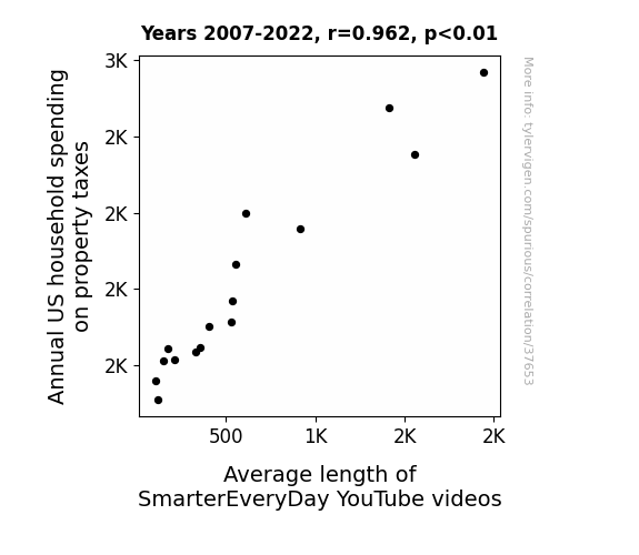 This means 92.5% of the change in the one variable (i.e., Average length of SmarterEveryDay YouTube videos) is predictable based on the change in the other (i.e., Annual US household spending on property taxes) over the 16 years from 2007 through 2022.