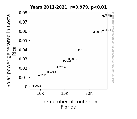 This means 95.9% of the change in the one variable (i.e., The number of roofers in Florida) is predictable based on the change in the other (i.e., Solar power generated in Costa Rica) over the 11 years from 2011 through 2021.