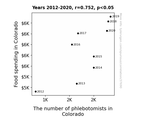 This means 56.6% of the change in the one variable (i.e., The number of phlebotomists in Colorado) is predictable based on the change in the other (i.e., Food spending in Colorado) over the 9 years from 2012 through 2020.