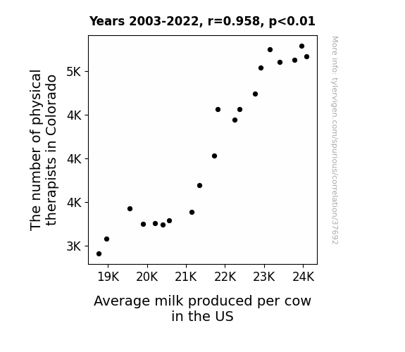This means 91.8% of the change in the one variable (i.e., Average milk produced per cow in the US) is predictable based on the change in the other (i.e., The number of physical therapists in Colorado) over the 20 years from 2003 through 2022.