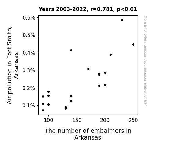This means 61% of the change in the one variable (i.e., The number of embalmers in Arkansas) is predictable based on the change in the other (i.e., Air pollution in Fort Smith, Arkansas) over the 20 years from 2003 through 2022.