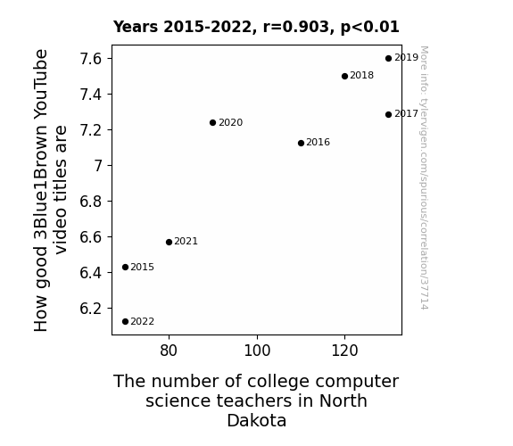 This means 81.5% of the change in the one variable (i.e., The number of college computer science teachers in North Dakota) is predictable based on the change in the other (i.e., How good 3Blue1Brown YouTube video titles are) over the 8 years from 2015 through 2022.