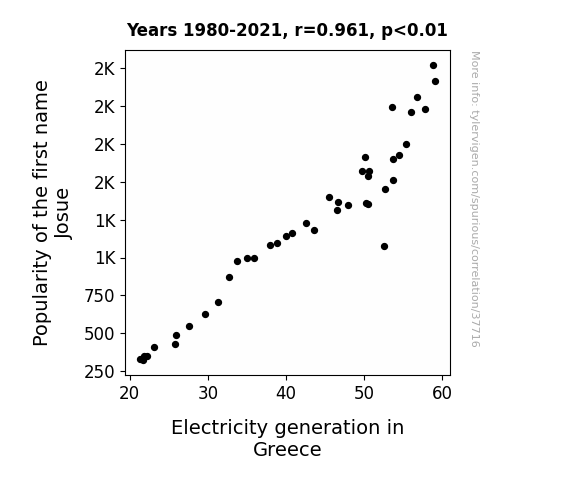 This means 92.3% of the change in the one variable (i.e., Electricity generation in Greece) is predictable based on the change in the other (i.e., Popularity of the first name Josue) over the 42 years from 1980 through 2021.