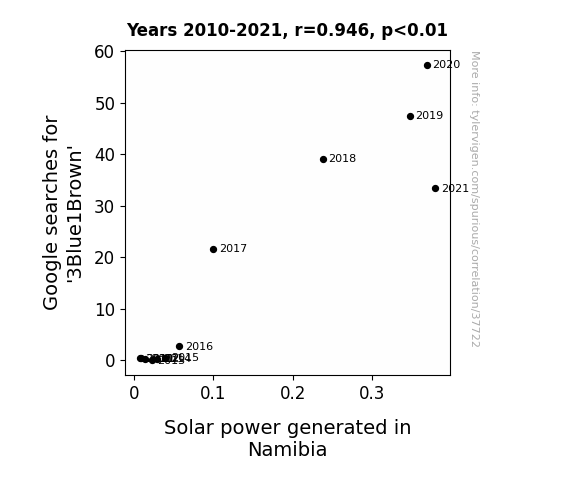 This means 89.4% of the change in the one variable (i.e., Solar power generated in Namibia) is predictable based on the change in the other (i.e., Google searches for '3Blue1Brown') over the 12 years from 2010 through 2021.