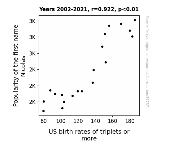 This means 84.9% of the change in the one variable (i.e., US birth rates of triplets or more) is predictable based on the change in the other (i.e., Popularity of the first name Nicolas) over the 20 years from 2002 through 2021.