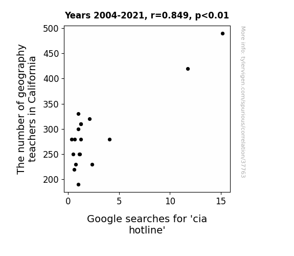 This means 72.1% of the change in the one variable (i.e., Google searches for 'cia hotline') is predictable based on the change in the other (i.e., The number of geography teachers in California) over the 18 years from 2004 through 2021.