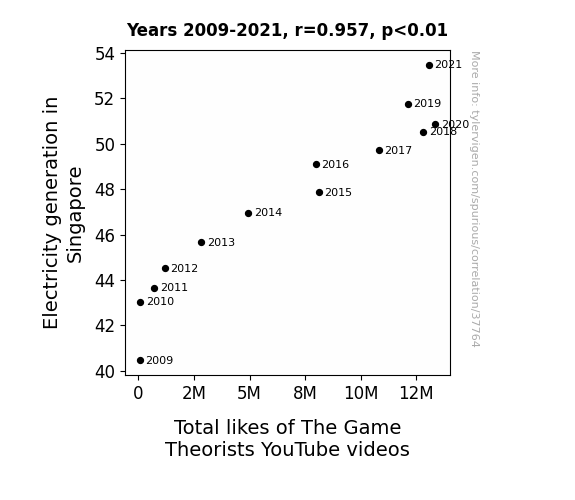 This means 91.7% of the change in the one variable (i.e., Total likes of The Game Theorists YouTube videos) is predictable based on the change in the other (i.e., Electricity generation in Singapore) over the 13 years from 2009 through 2021.