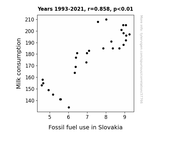 This means 73.6% of the change in the one variable (i.e., Fossil fuel use in Slovakia) is predictable based on the change in the other (i.e., Milk consumption) over the 29 years from 1993 through 2021.