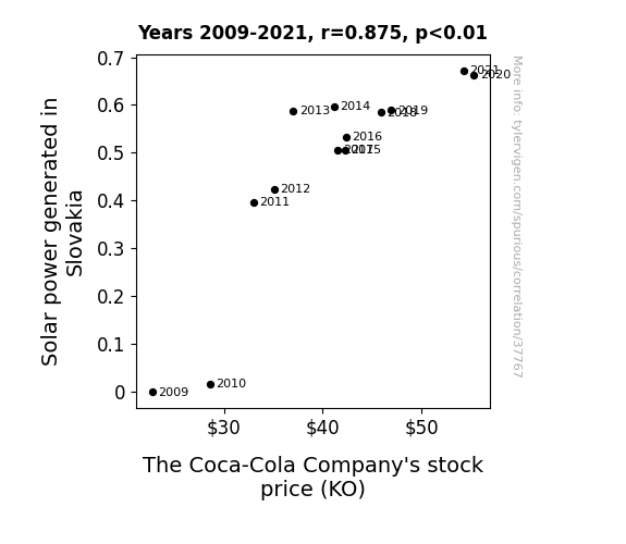This means 76.6% of the change in the one variable (i.e., The Coca-Cola Company's stock price (KO)) is predictable based on the change in the other (i.e., Solar power generated in Slovakia) over the 13 years from 2009 through 2021.