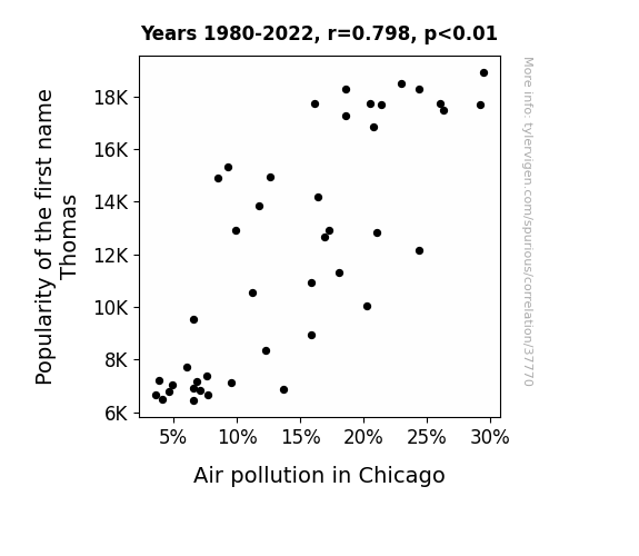 This means 63.6% of the change in the one variable (i.e., Air pollution in Chicago) is predictable based on the change in the other (i.e., Popularity of the first name Thomas) over the 43 years from 1980 through 2022.