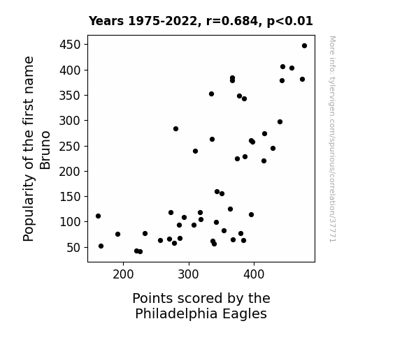 This means 46.8% of the change in the one variable (i.e., Points scored by the Philadelphia Eagles) is predictable based on the change in the other (i.e., Popularity of the first name Bruno) over the 48 years from 1975 through 2022.