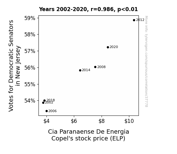 This means 97.3% of the change in the one variable (i.e., Cia Paranaense De Energia Copel's stock price (ELP)) is predictable based on the change in the other (i.e., Votes for Democratic Senators in New Jersey) over the 7 years from 2002 through 2020.