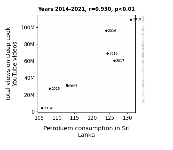 This means 86.4% of the change in the one variable (i.e., Petroluem consumption in Sri Lanka) is predictable based on the change in the other (i.e., Total views on Deep Look YouTube videos) over the 8 years from 2014 through 2021.