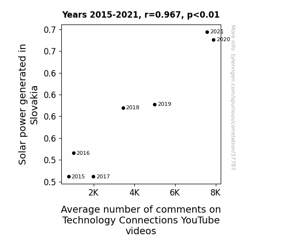 This means 93.5% of the change in the one variable (i.e., Average number of comments on Technology Connections YouTube videos) is predictable based on the change in the other (i.e., Solar power generated in Slovakia) over the 7 years from 2015 through 2021.
