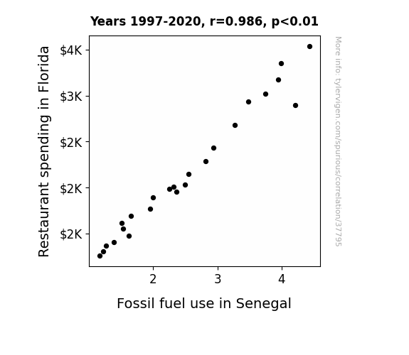 This means 97.2% of the change in the one variable (i.e., Fossil fuel use in Senegal) is predictable based on the change in the other (i.e., Restaurant spending in Florida) over the 24 years from 1997 through 2020.