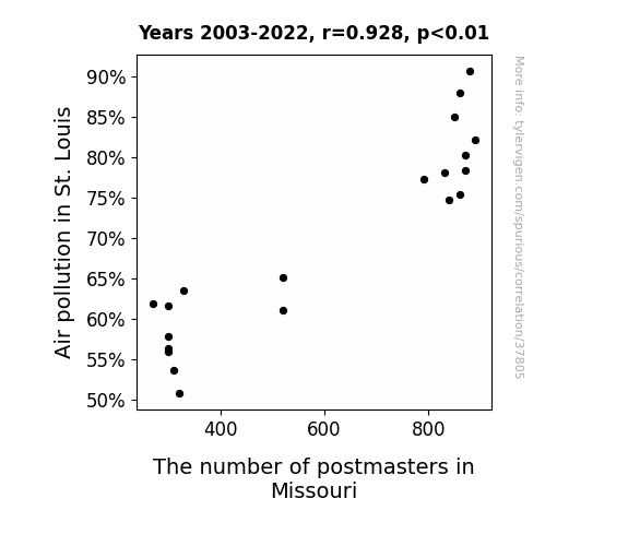 This means 86.2% of the change in the one variable (i.e., The number of postmasters in Missouri) is predictable based on the change in the other (i.e., Air pollution in St. Louis) over the 20 years from 2003 through 2022.