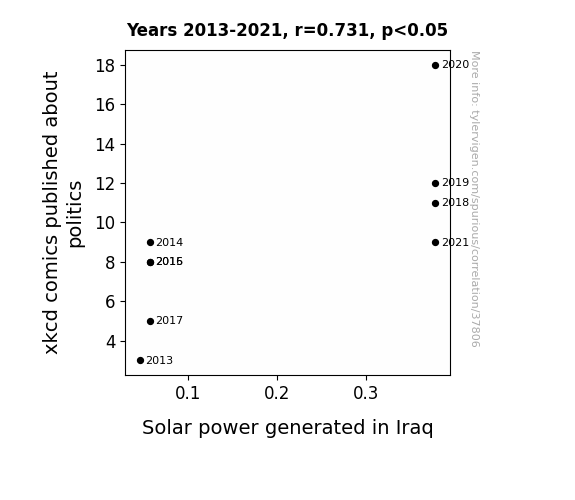 This means 53.4% of the change in the one variable (i.e., Solar power generated in Iraq) is predictable based on the change in the other (i.e., xkcd comics published about politics) over the 9 years from 2013 through 2021.