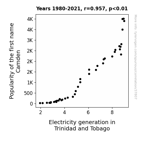 This means 91.7% of the change in the one variable (i.e., Electricity generation in Trinidad and Tobago) is predictable based on the change in the other (i.e., Popularity of the first name Camden) over the 42 years from 1980 through 2021.