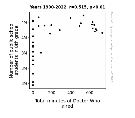This means 26.6% of the change in the one variable (i.e., Total minutes of Doctor Who aired) is predictable based on the change in the other (i.e., Number of public school students in 8th grade) over the 33 years from 1990 through 2022.