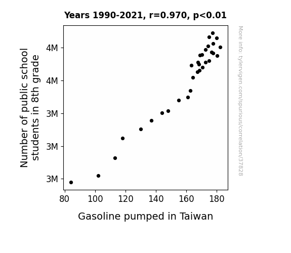 This means 94.1% of the change in the one variable (i.e., Gasoline pumped in Taiwan) is predictable based on the change in the other (i.e., Number of public school students in 8th grade) over the 32 years from 1990 through 2021.