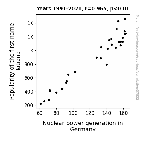This means 93.1% of the change in the one variable (i.e., Nuclear power generation in Germany) is predictable based on the change in the other (i.e., Popularity of the first name Tatiana) over the 31 years from 1991 through 2021.