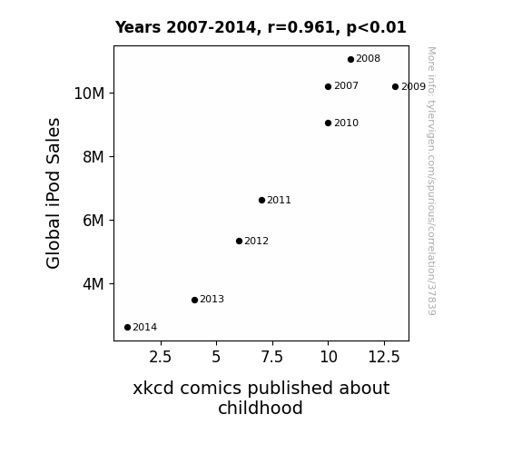 This means 92.3% of the change in the one variable (i.e., xkcd comics published about childhood) is predictable based on the change in the other (i.e., Global iPod Sales) over the 8 years from 2007 through 2014.