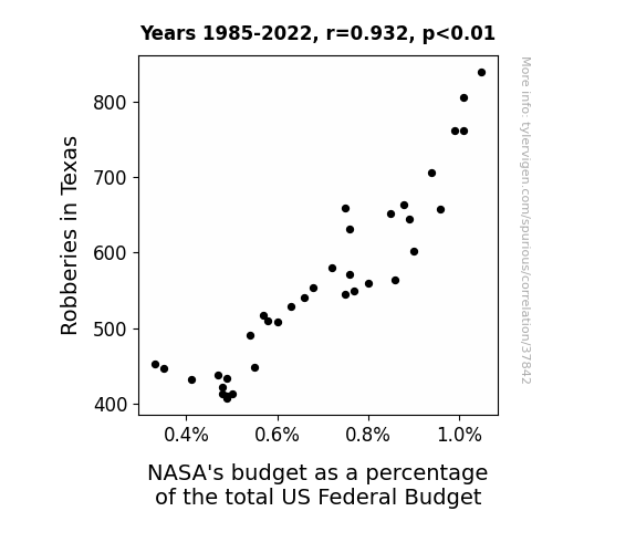 This means 86.9% of the change in the one variable (i.e., NASA's budget as a percentage of the total US Federal Budget) is predictable based on the change in the other (i.e., Robberies in Texas) over the 38 years from 1985 through 2022.