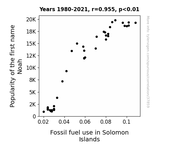 This means 91.2% of the change in the one variable (i.e., Fossil fuel use in Solomon Islands) is predictable based on the change in the other (i.e., Popularity of the first name Noah) over the 42 years from 1980 through 2021.