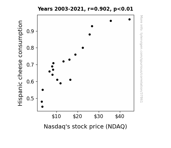 This means 81.3% of the change in the one variable (i.e., Nasdaq's stock price (NDAQ)) is predictable based on the change in the other (i.e., Hispanic cheese consumption) over the 19 years from 2003 through 2021.