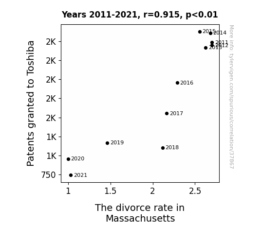 This means 83.7% of the change in the one variable (i.e., The divorce rate in Massachusetts) is predictable based on the change in the other (i.e., Patents granted to Toshiba) over the 11 years from 2011 through 2021.