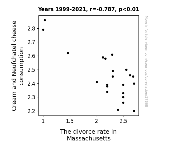 This means 61.9% of the change in the one variable (i.e., The divorce rate in Massachusetts) is predictable based on the change in the other (i.e., Cream and Neufchatel cheese consumption) over the 23 years from 1999 through 2021.