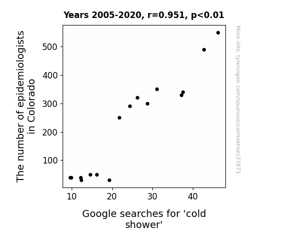 This means 90.4% of the change in the one variable (i.e., Google searches for 'cold shower') is predictable based on the change in the other (i.e., The number of epidemiologists in Colorado) over the 16 years from 2005 through 2020.